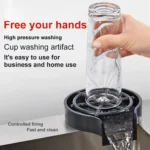 Uitgerust met een speciaal ontworpen sproeikop die zelfs de moeilijkst bereikbare delen van het glas reinigt, voor een volledige en gelijkmatige reiniging van binnenkant én randen.